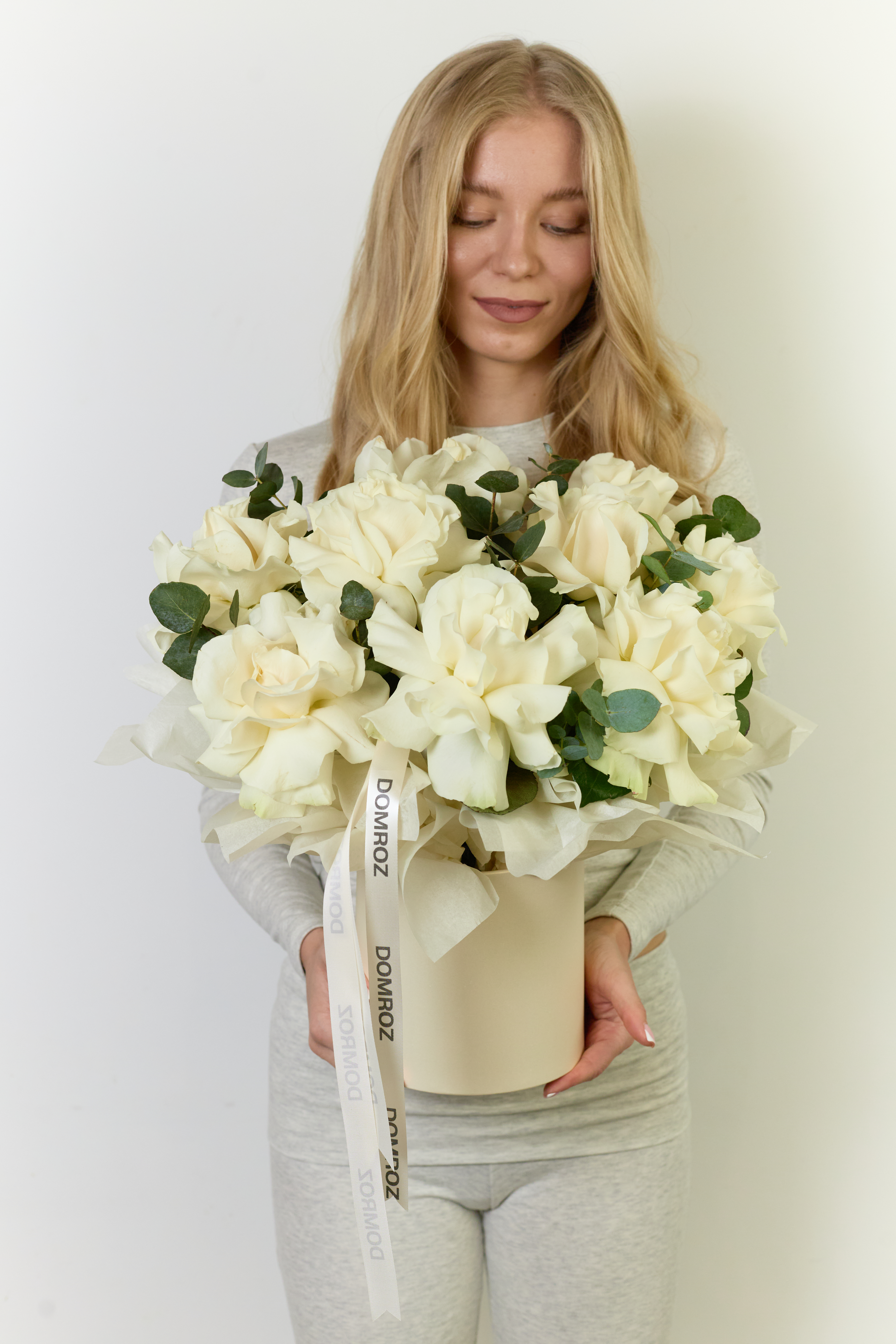 Белые ажурные розы в шляпной коробке