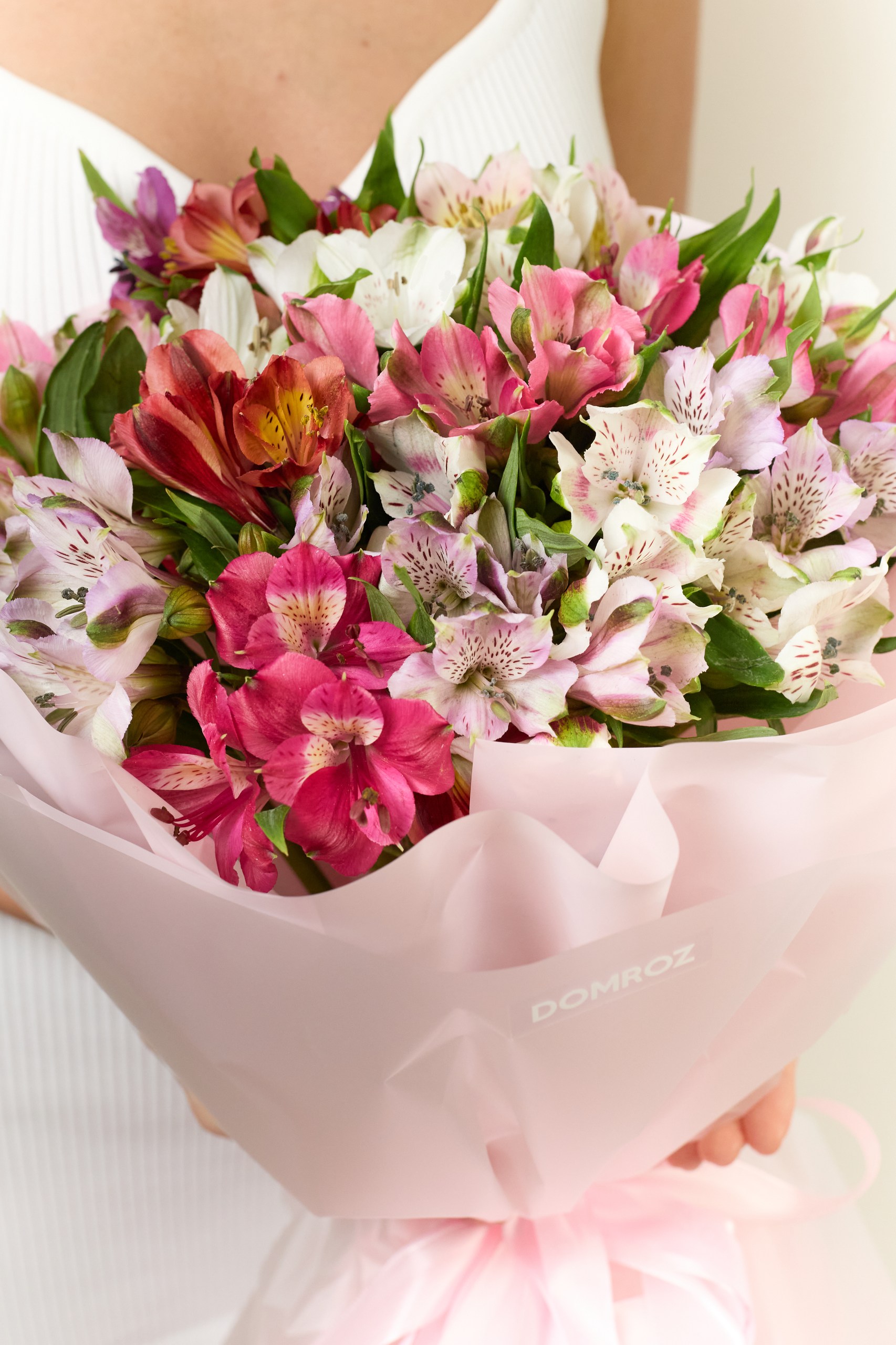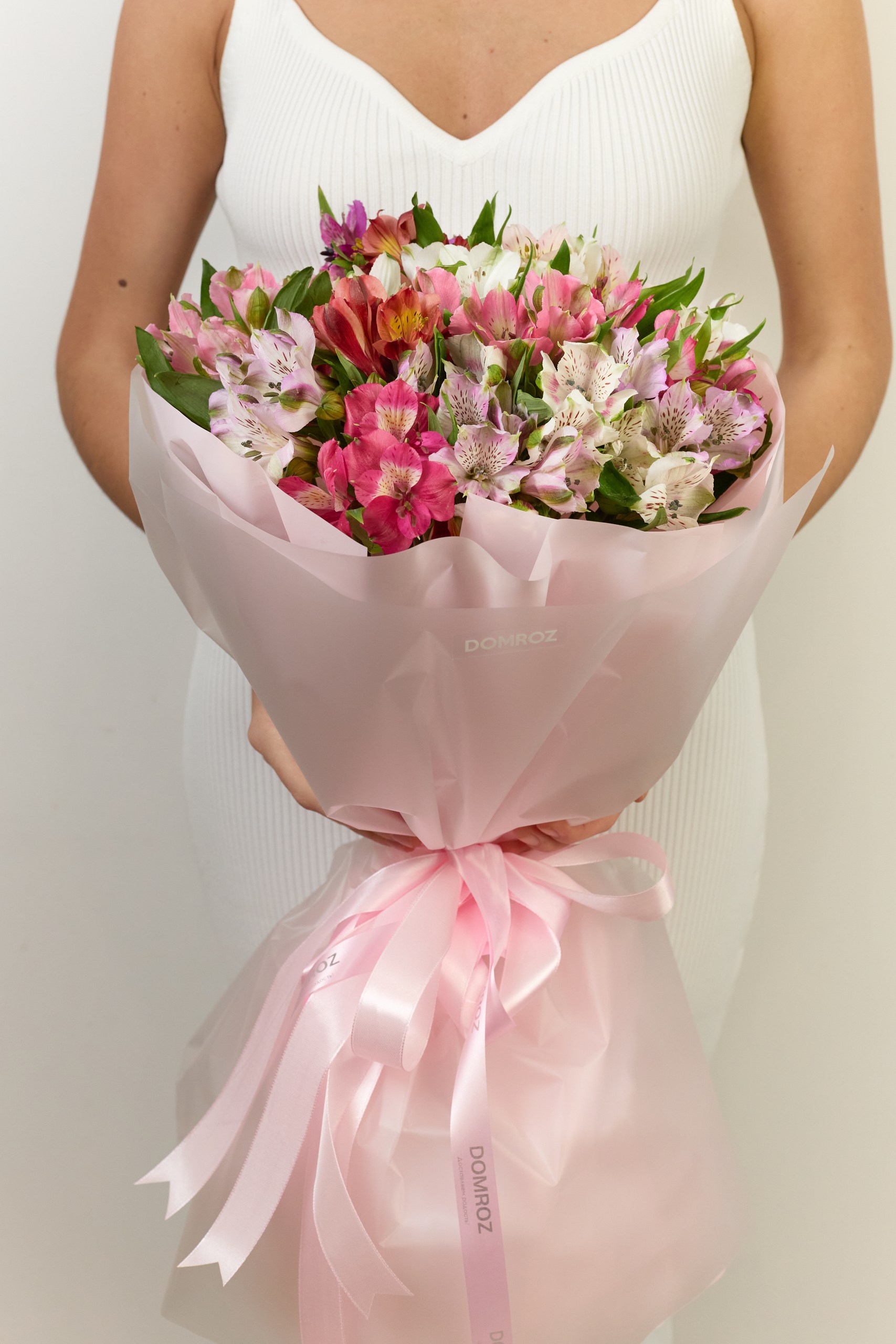 Фото является примером. Букет собирается из альстромерий разных оттенков, и собранный букет может отличаться по цветовой гамме от первоначального фото.