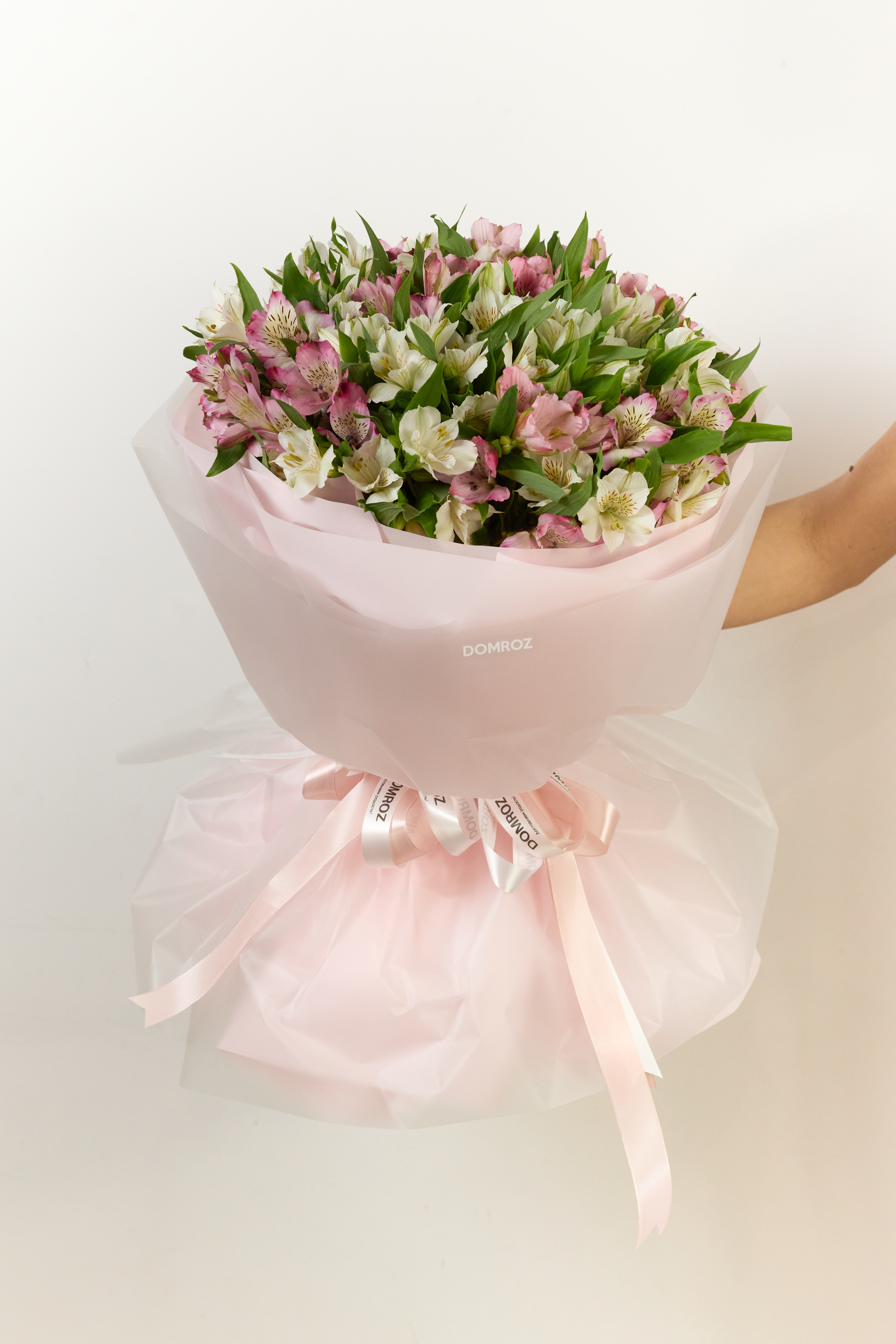 Фото является примером. Букет собирается из альстромерий разных оттенков, и собранный букет может отличаться по цветовой гамме от первоначального фото.