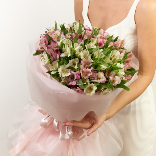 Фото является примером. Букет собирается из альстромерий разных оттенков, и собранный букет может отличаться по цветовой гамме от первоначального фото.