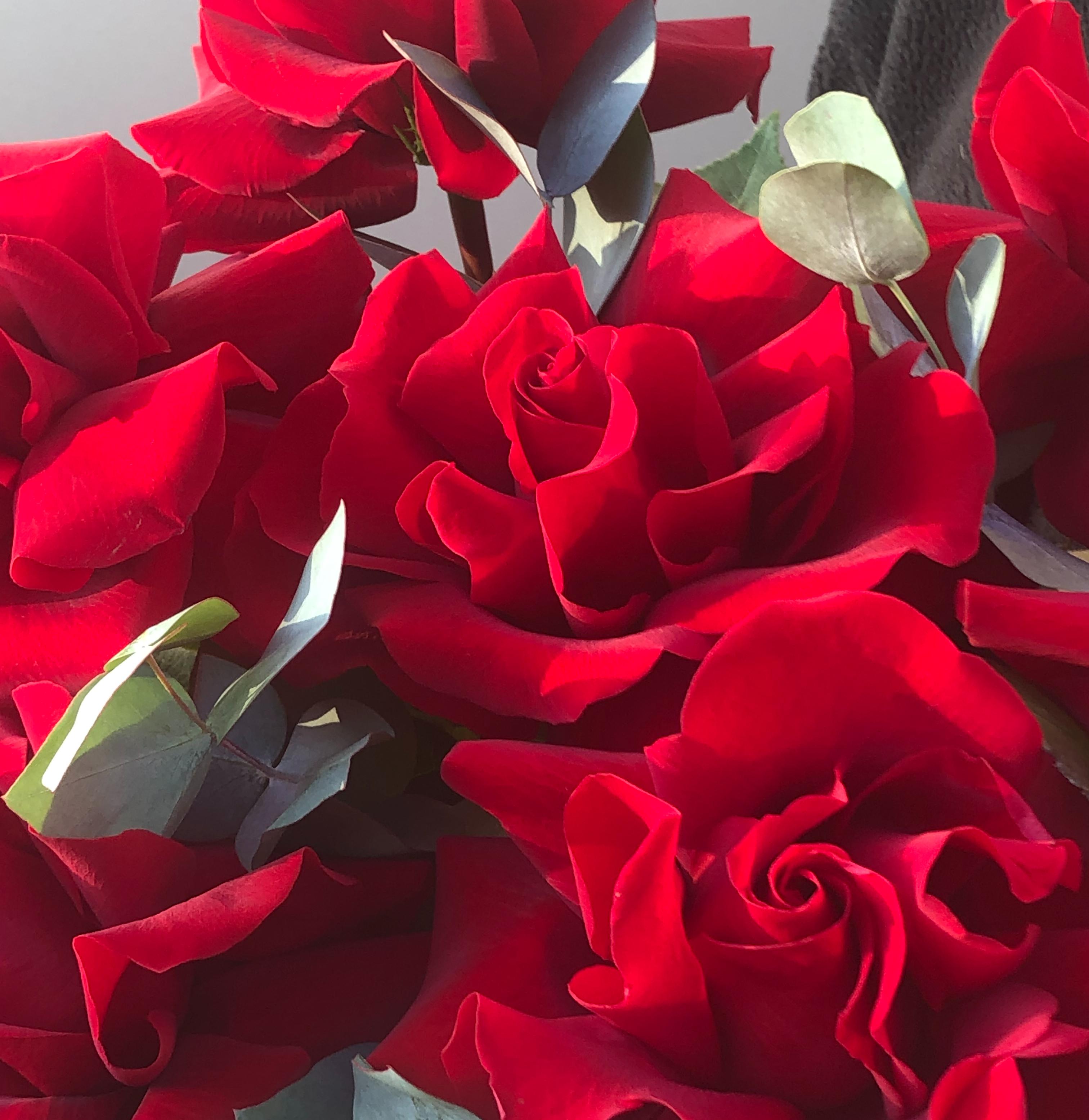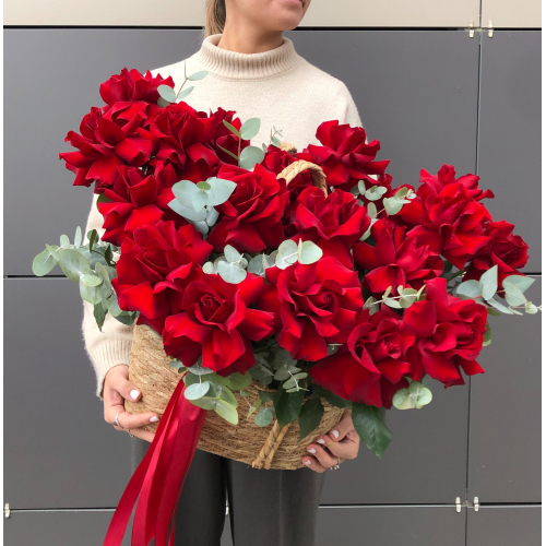 Корзина с 9 красными ажурными розами и эвкалиптом