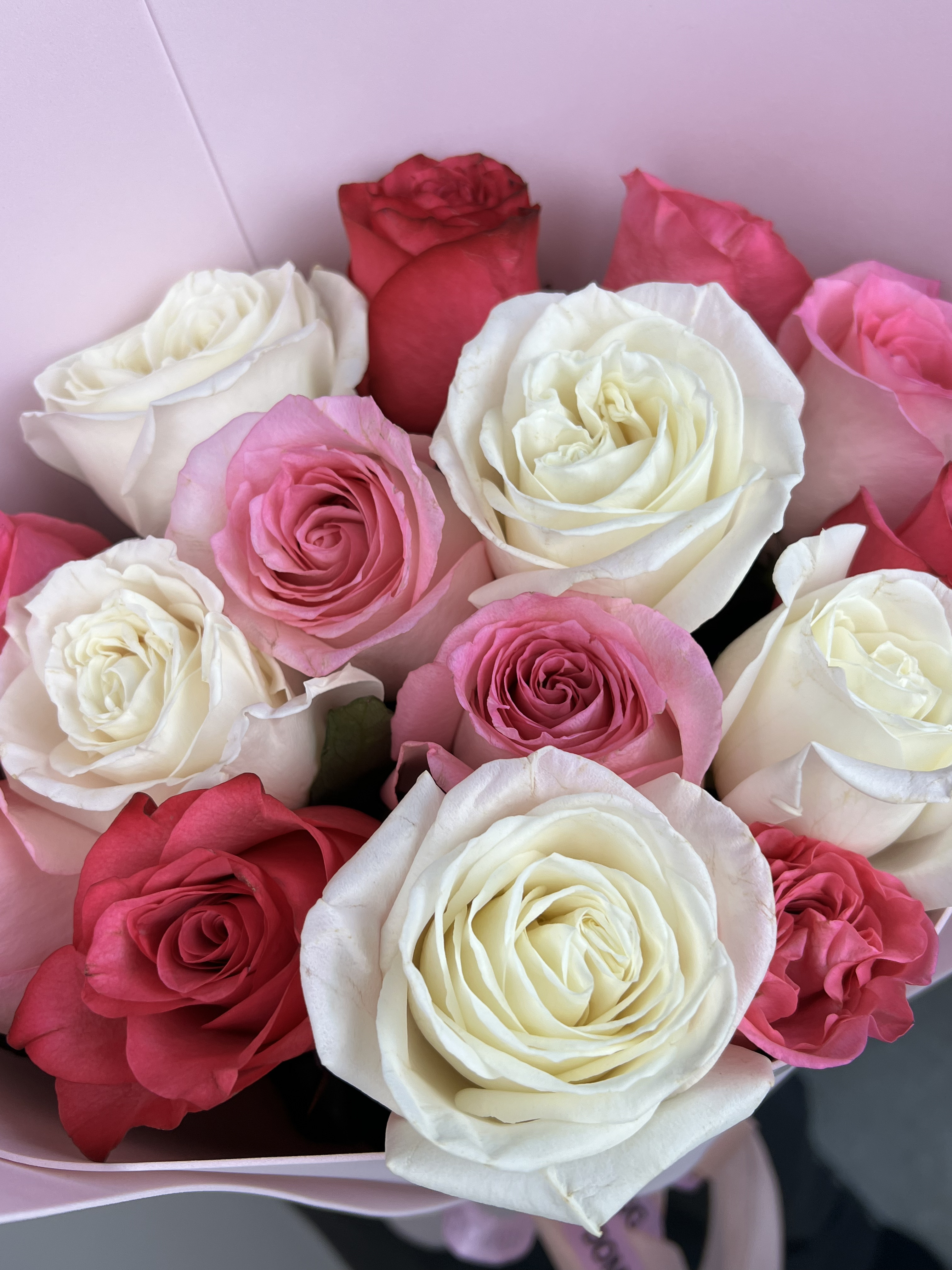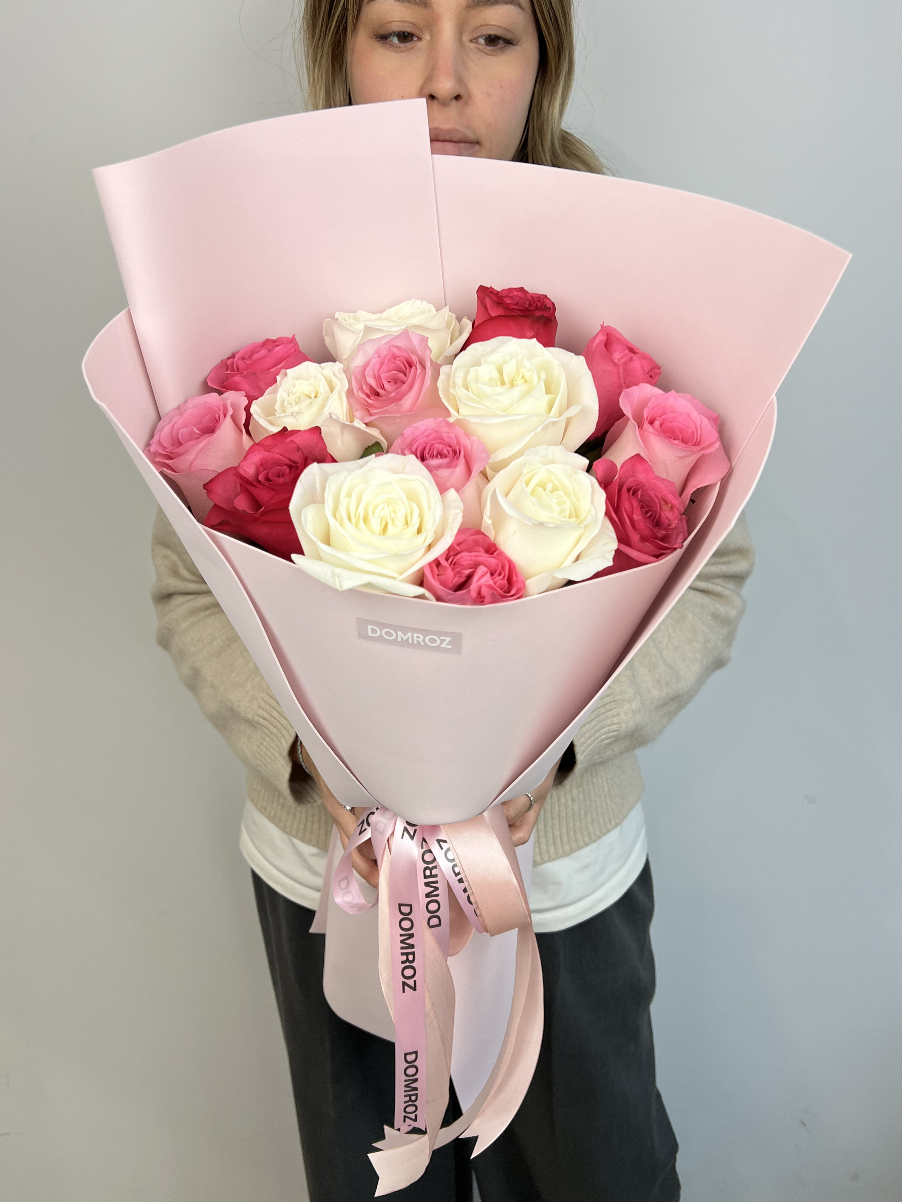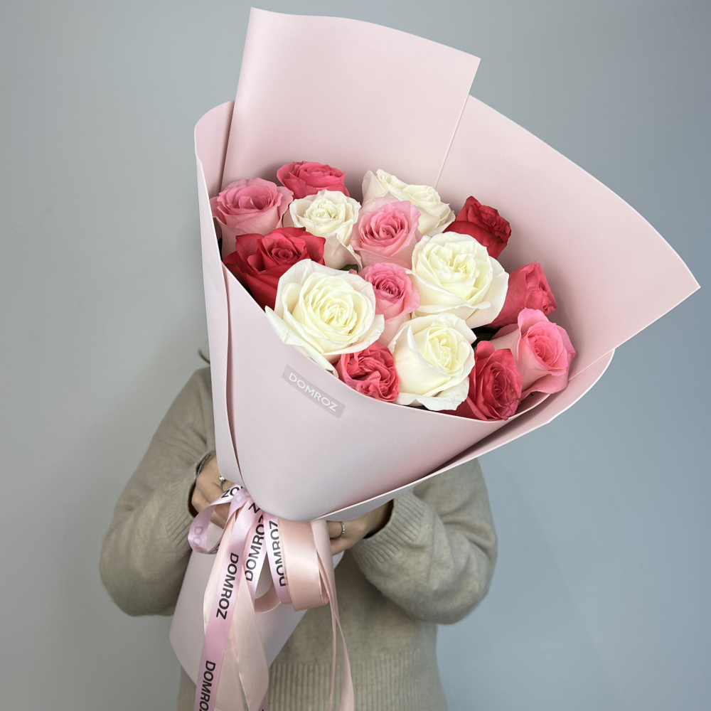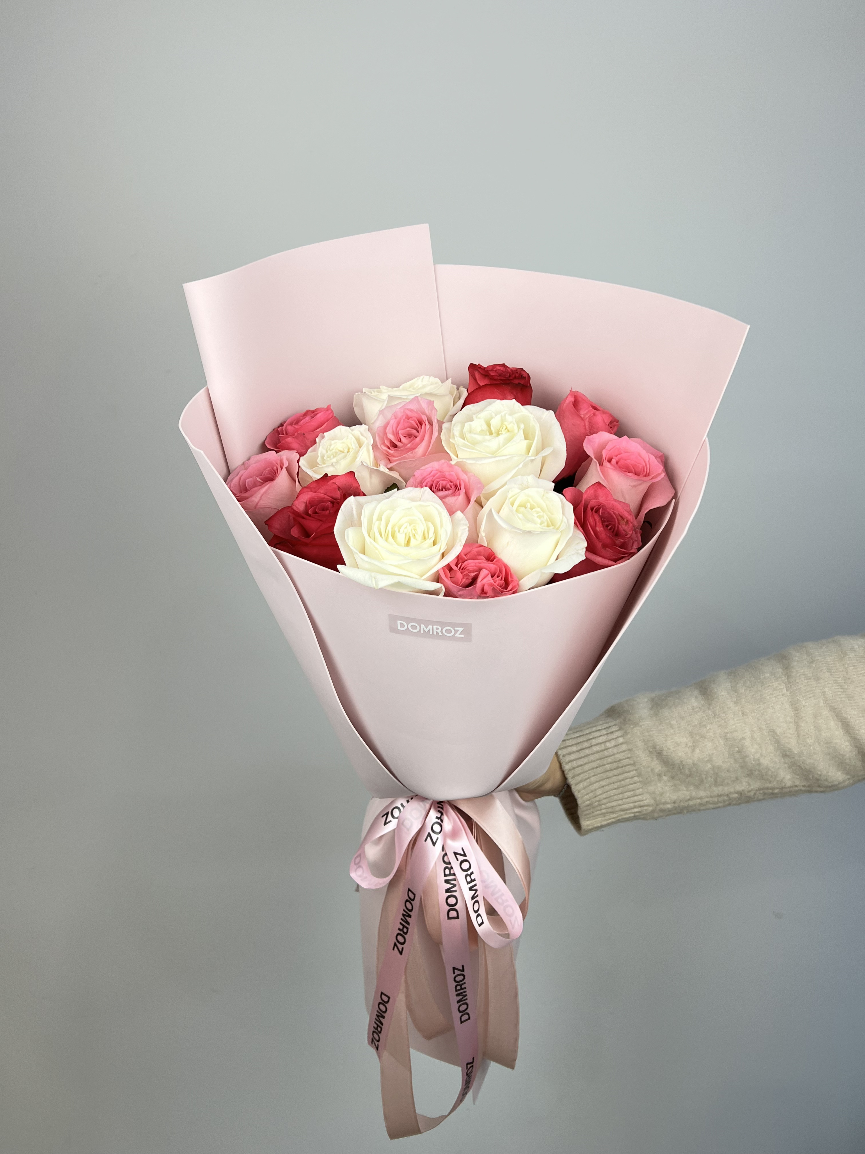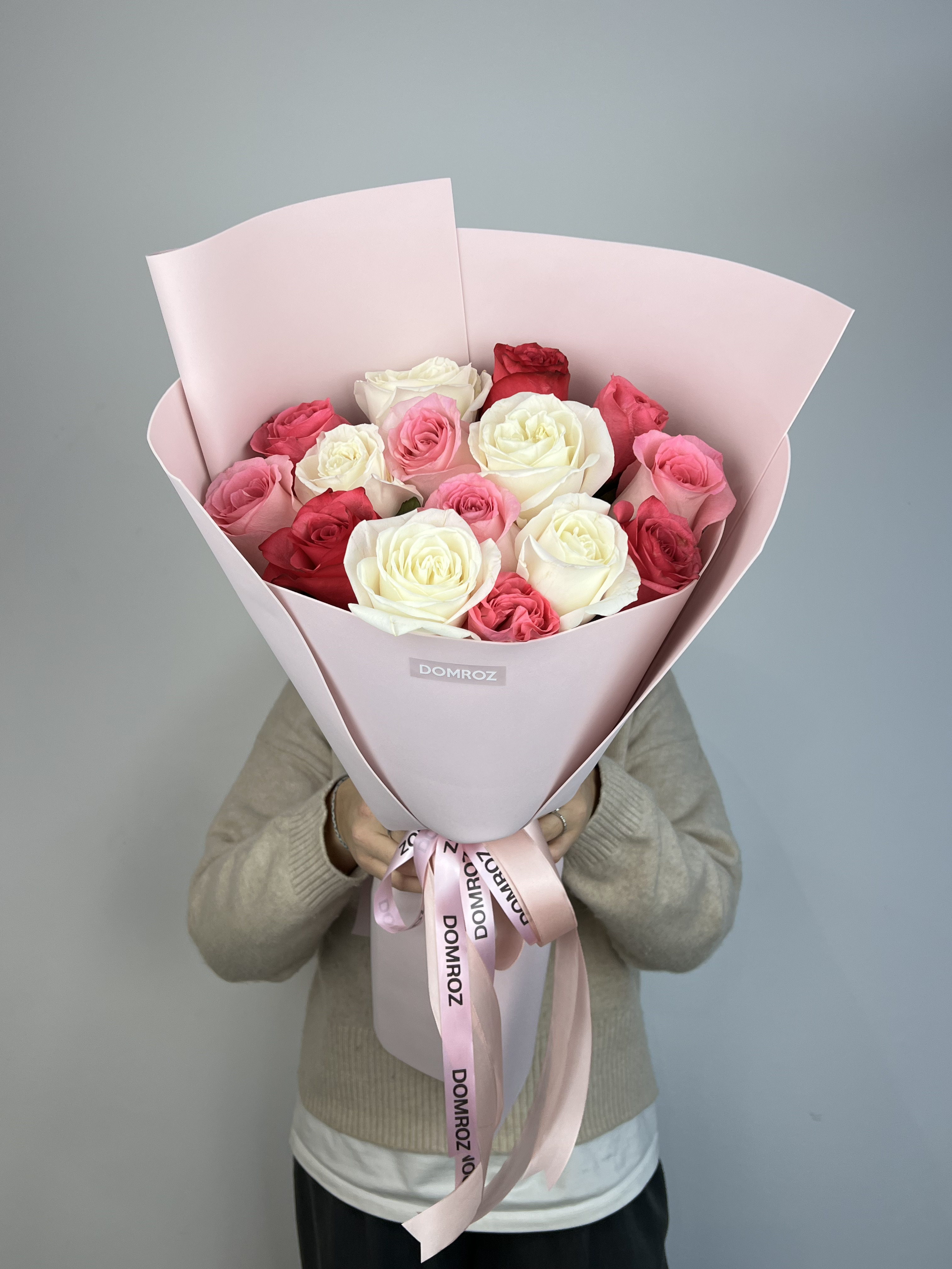 Фото является примером. Букет собирается из роз разных оттенков, и собранный букет может отличаться по цветовой гамме от первоначального фото.