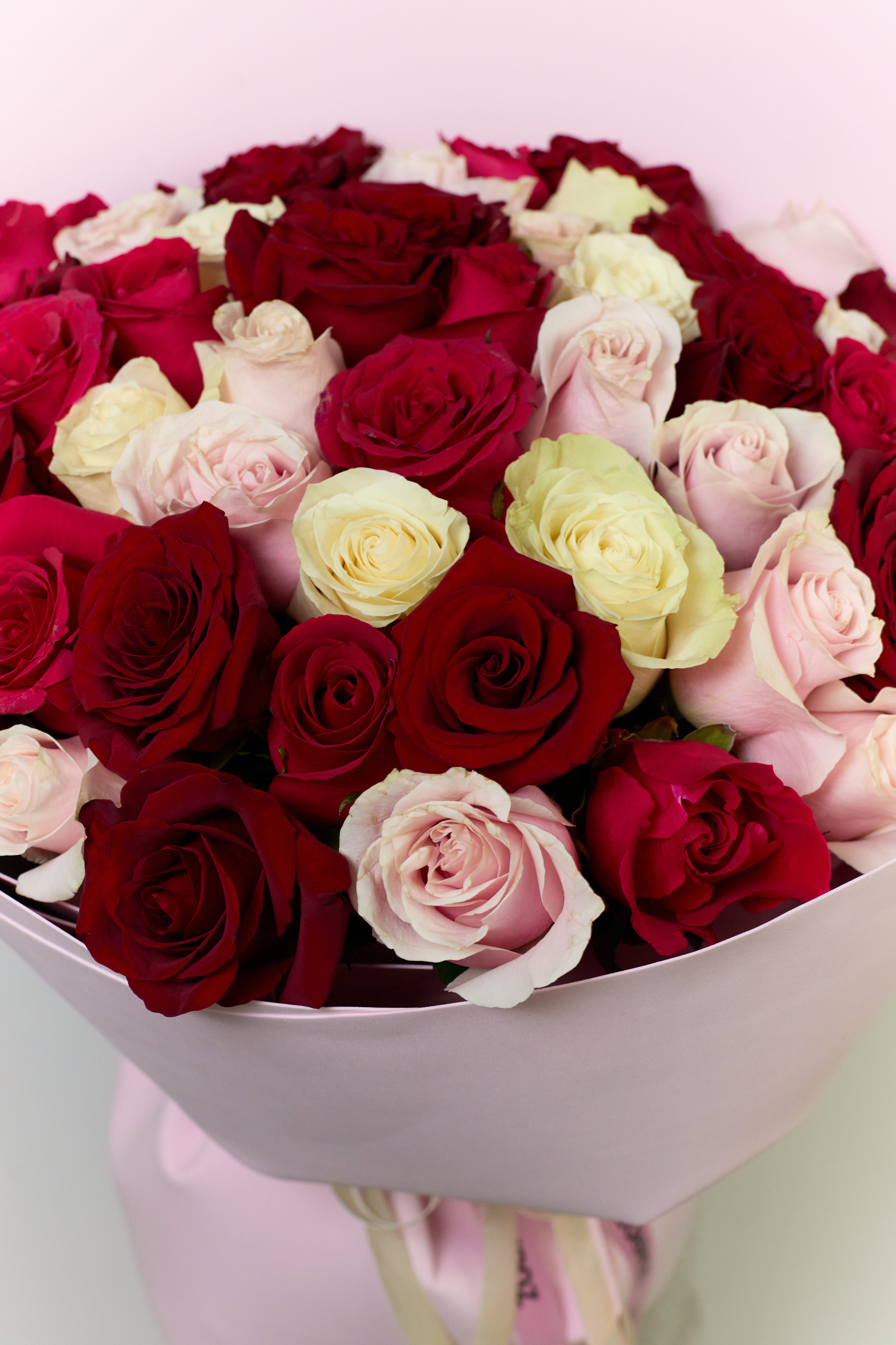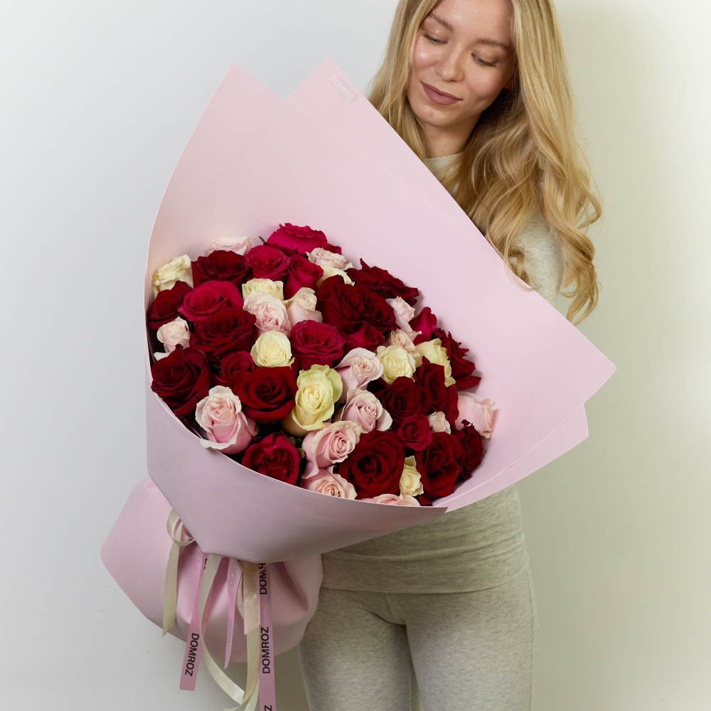 Фото является примером. Букет собирается из роз разных оттенков, и собранный букет может отличаться по цветовой гамме от первоначального фото.