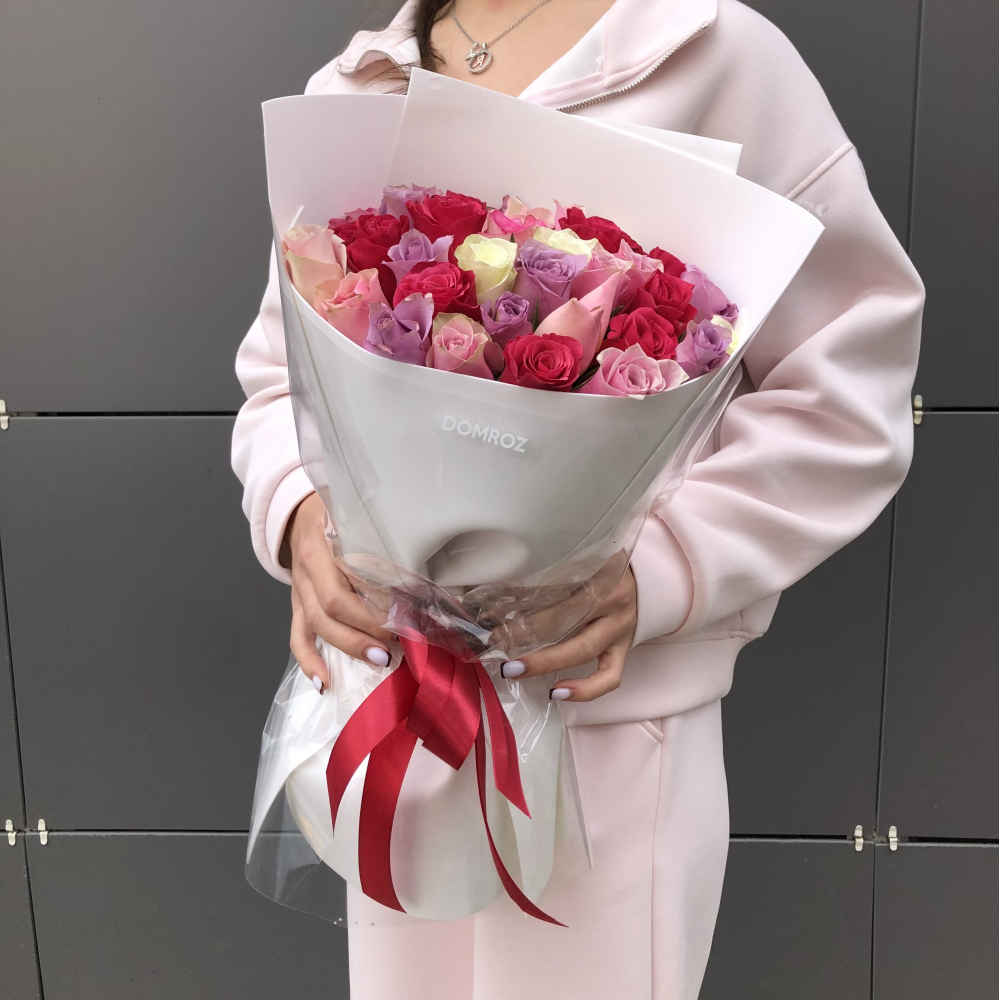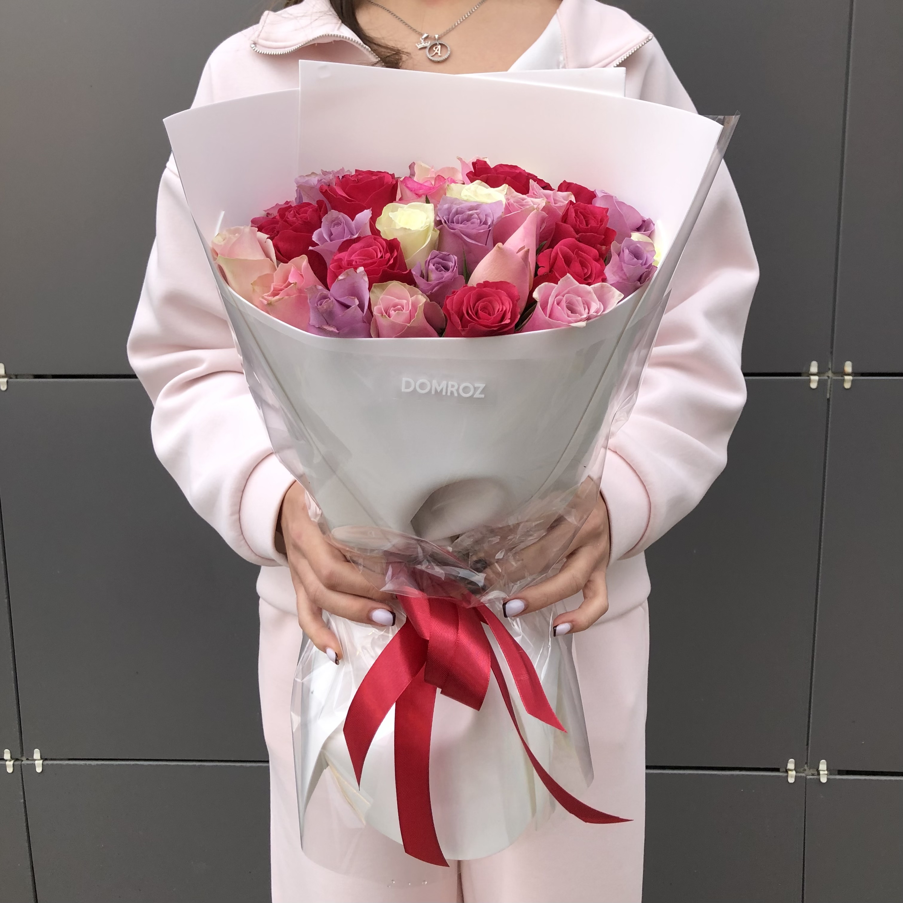 Фото является примером. Букет собирается из роз разных оттенков, и собранный букет может отличаться по цветовой гамме от первоначального фото.