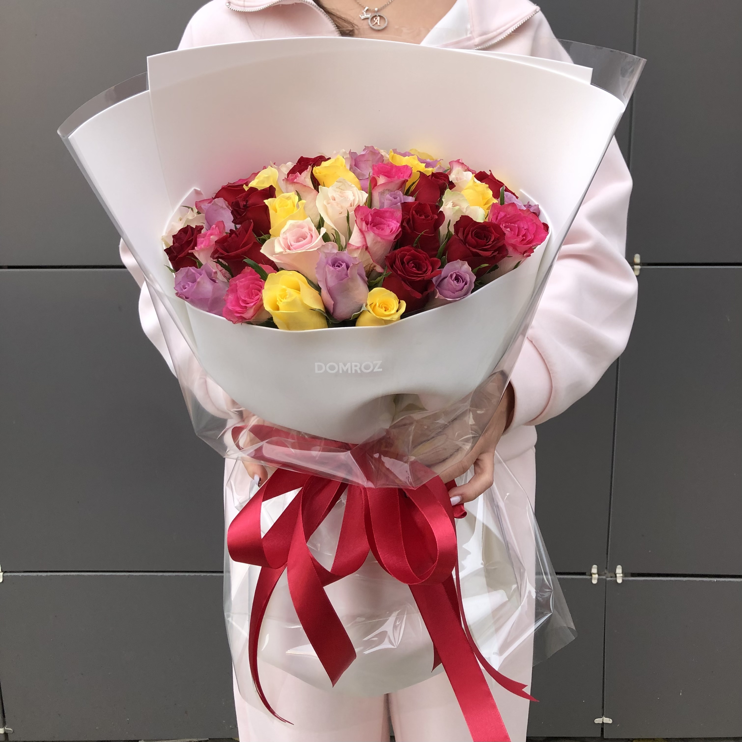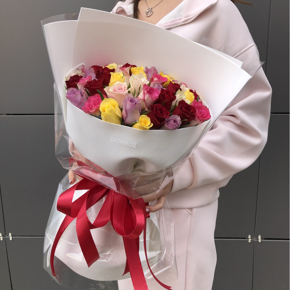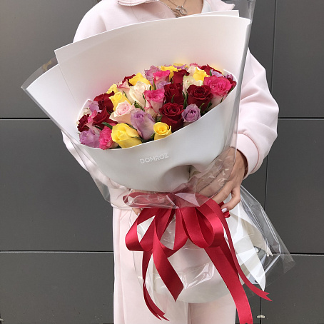 Фото является примером. Букет собирается из роз разных оттенков, и собранный букет может отличаться по цветовой гамме от первоначального фото.