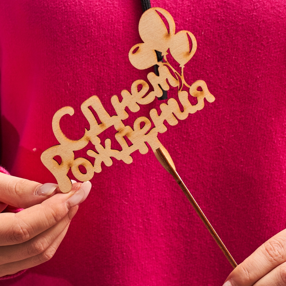 Топпер выступает в качестве дополнения к цветочным букетам и композициям – это вырезанные из легкой березовой фанеры надписи и фигурки.